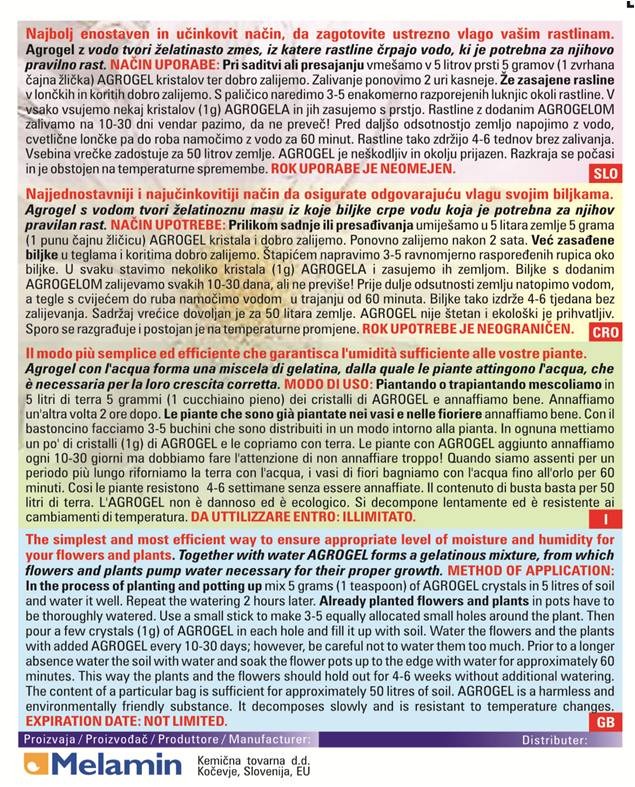 Agrogel je granuliran brezbarven nevtralni polimer, ki na svojo težo veže več 100-kratno količino vode, zato je zelo primeren za uporabo v cvetličarstvu, vrtnarstvu in kmetijstvu.